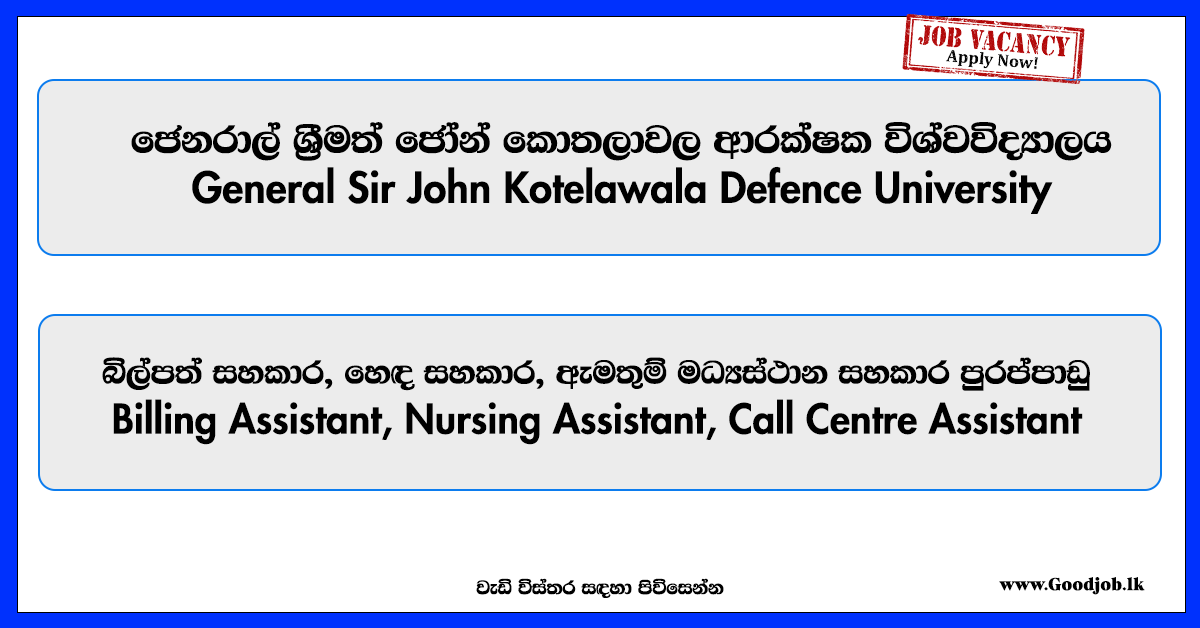 Billing Assistant, Nursing Assistant, Call Centre Assistant - General Sir John Kotelawala Defence University-si