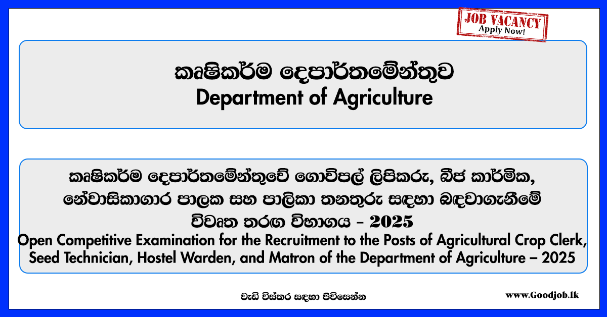 Farm clerk, Seed Technician, Hostel Warden – Department of Agriculture Job Vacancies 2025