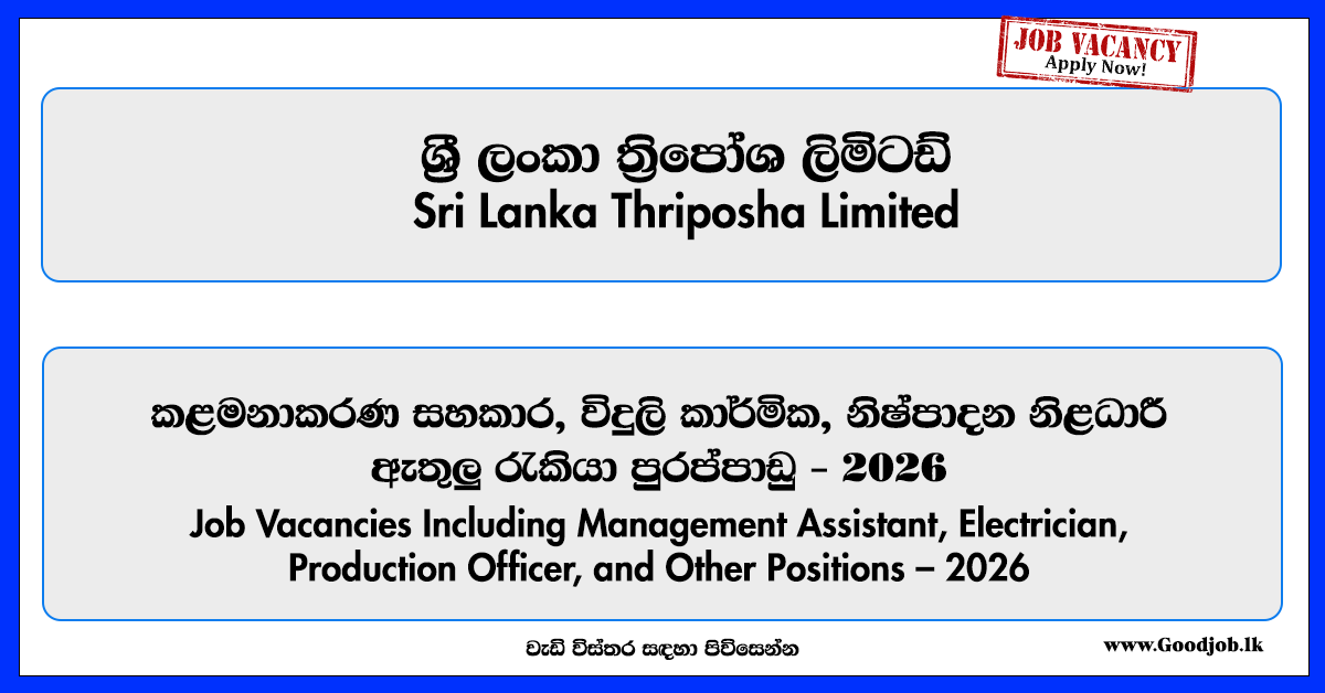 Management Assistant, Electrician, Production Officer – Sri Lanka Thriposha Limited Job Vacancies 2026